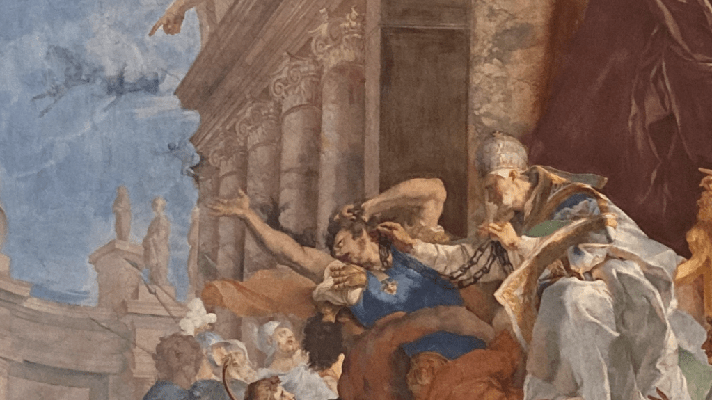 969 AD: Devotion grows when Pope John XIII uses the chains to exorcise evil spirits from the count of the emperor Otho. (*Details of this story are hard to come by, but it is certainly that which is pictured in the ceiling of the current church.)