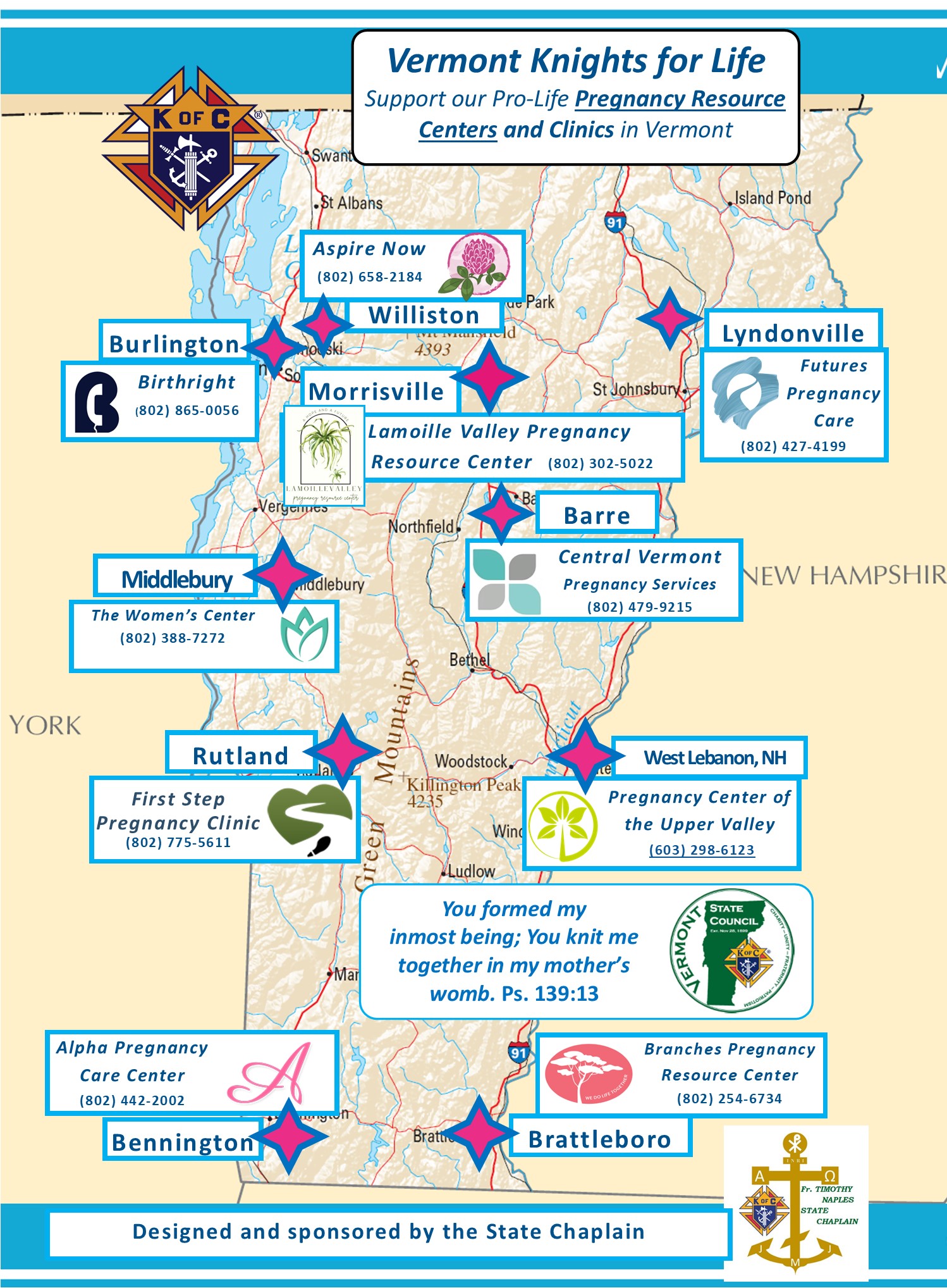 Pregnancy Resource Centers and Clinics Serving Vermont – New 2026 Poster for our Catholic Churches Sponsored by the Knights of Columbus, Vermont State Council FOR OUR VERMONT CATHOLIC CHURCHES, DOWNLOAD THE LATEST POSTER Knights for Life Poster January 2026 JPEGDownload Share this: Share on X (Opens in new window) X Share on Facebook (Opens in new window) Facebook Like Loading...